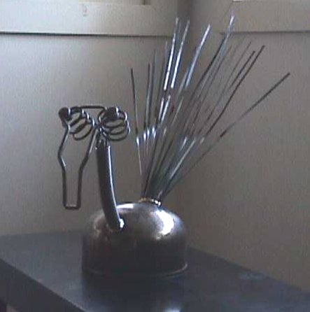 "This is my 19th anniversary present and is a combination of a turkey and Gonzo from the Muppets. She will be nesting in the flower garden in the future. She is made from a tea kettle, a bicycle seat and an old rake. Isn't Sandy amazing?" |
