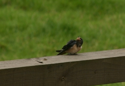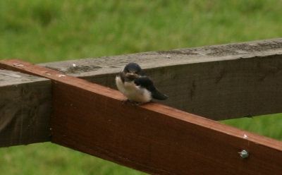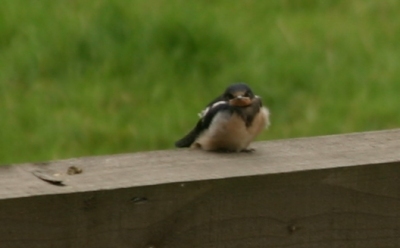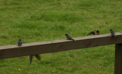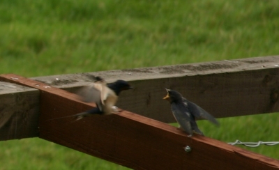 We had a splendid opportunity the other day when five baby swallows came and camped on the pergola just outside the kitchen window. While these photos won't win any photography awards, the youngsters and their tireless parents were a joy to watch. Mum and dad scurried about over the field to the south gathering food for the youngsters who squawked and flapped their wings about whenever the parents came near. They were on the pergola for about an hour before fluttering off somewhere else. |