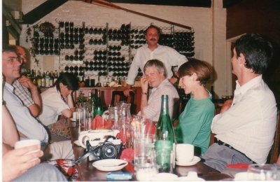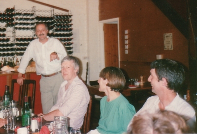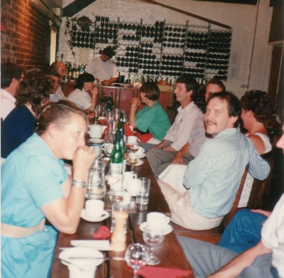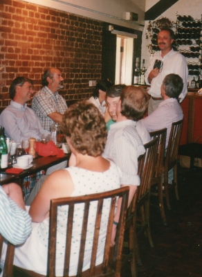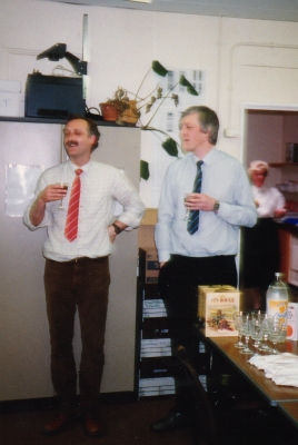 Vivien very kindly provided a raft of photographs from "the good old days". This one we "think" is at the official opening in November 1986 - pity that both Dave and Greg have such poor taste in ties. The ones below are from Dave Walton's "retirement" celebration (well, at least we were celebrating) at the Cherwell Boathouse. |