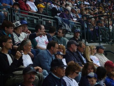 At least those who congregated in Seattle this past weekend didn't have their enjoyment spoiled by the rain. I am, of course, referring to the Webb class of '69 mini-reunion held at the Seattle Mariners – Cincinnati Reds baseball game on Sunday which saw Rick Robertson, Miles Rosedale, Trey Shonnard and even Todd Rosenberg (along with their respective wives and/or girlfriends) gather along with Susie, Emily and David Keeler to join our pal Pete as he continues his expedition following his enforced sabbatical in Albuquerque. While I gather it did rain (how could it not rain in Seattle?) the baseball stadium has a roof which can be closed to ensure the baseball continues unabated. Now there's a town which is prepared for the rain. Why don't we erect a roof to cover the entire British Isles? Susie sent the attached which was taken by Emily.