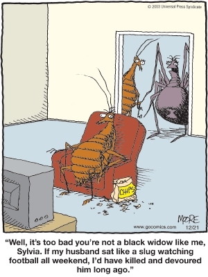 Then, as if that wasn’t enough excitement and entertainment for one evening, we meandered back towards Covent Garden for a fabulously festive feast at Wahaca, a Mexican restaurant which has recently opened to, admittedly, mixed reviews but which we found to be excellent. It’s rather like the experience we had of tapas in Spain with a plethora of nibbles and finger food arriving at your table in a seemingly endless stream, all of which was very good indeed. You can read one of the reviews here or Google it yourself for further enlightenment. And so, after a feast of entertainment and a further feast of fine Mexican food, it was back on the train to Banbury and home to bed prior to this morning’s excitement. Regrettably, this morning’s activities are what have delayed the arrival of this weak’s news – we set off about 9.00 to the airport where we collected our Ben who had decided, on a spur of the moment, to spend Christmas in the UK with us. Donna, unfortunately, is working but we are delighted to have his company even if our plans of bunkering down with a bottle of wine and a turkey sandwich on Christmas day have now been escalated to the extent that on the way back from the airport we were compelled to gird our loins and battle the teeming hordes at Tesco. Having filled one of the extra-large shopping trolleys to overflowing and parted with much of our life savings, we now have the makings of several feasts which, as I say, will take us until sometime Tuesday afternoon to make our way through. And so, I hope you will forgive the tardiness and I hope your festive celebrations turn out to be every bit as grand and enjoyable as you could possibly imagine. Ours have begun in fine fashion and we anticipate maintaining this taxing and demanding pace throughout. Wish us luck! Finally, I ran across this the other day which reminded me how grateful I am that Penelope is not a Black Widow. Love to you all, Greg What would have happened if on the first Christmas, there had been three wise women instead of three wise men? They would have: * asked for directions * arrived on time * helped deliver the baby * cleaned the stable * brought more practical gifts, and * made a casserole. But, women shouldn't necessarily gloat about these truths, since there are several other truths here. After they left, they'd be saying to each other: * Did you see the sandals Mary was wearing with that gown? * Did you see the drummer boy?! He can beat my drum anytime. * That donkey they're riding has seen better days. * I hear that Joseph isn't even working right now. * Virgin? Hah! I knew her in school days! * That baby doesn't look anything like Joseph. * Wanna bet how long it will take to get your casserole dish back? "I had the strangest dream last night," Morris was telling his psychiatrist. "I saw my mother, but when she turned around to look at me, I noticed that she had your face. As you can imagine, I found this very disturbing. In fact I woke up immediately, and couldn't get back to sleep. "I just lay there in bed waiting for morning to come, and then I got up, drank a Coke, and came right over here for my appointment. I thought you could help me explain the meaning of this strange dream." The psychiatrist was silent for a full minute before responding, "A Coke? That's a breakfast?" A father, son and grandson go out to the country club for their weekly round of golf. Just as they reach the first tee, a beautiful young blonde woman carrying her bag of clubs approaches them. She explains that the member who brought her to the club for a round of golf had an emergency which called him away and asks the trio whether she can join them. Naturally, the guys all agree. Smiling, the blonde thanks them and says, "Look, fellas, I work in a topless bar as a dancer, so nothing shocks me anymore. If any of you wants to smoke cigars, have a beer, bet, swear or tell off-color stories or do anything that you normally do when playing a round together, go ahead. But I enjoy playing golf, consider myself pretty good at it, so don't try to coach me on how to play my shots." With that the guys agree to relax and invite her to drive first. All eyes are fastened on her shapely behind as she bends to place her ball on the tee. She then takes her driver and hits the ball 270 yards down the middle, right in front of the green. The father's mouth is agape. "That was beautiful," said the dad. The blonde puts her driver away and says, "I really didn't get into it and I should have faded it a little more." After the three guys hit their drives and their second shots (she was closest to the pin) the blonde takes out a nine iron and lofts the ball within five feet of the hole. The son says "damn, lady, you played that perfectly." The blonde frowns and says, "it was a little weak. I've left a tricky little putt." After the son buries a long putt for a par, dad two putts for a bogey and granddad overruns the green with his pitching wedge, chips back and putts for a double bogey, the blonde taps in the five-footer for a birdie. The guys all congratulate her on her fine game. She puts her putter back in the bag and says, "Thanks, but I really haven't played much lately, and I'm a little rusty. "Maybe I'll really get into this next drive." Having the honors, she drives first on the second hole and knocks the hell out of the ball, and it lands nearly 300 yards away smack in the middle of the fairway. For the rest of the round the statuesque blonde continues to amaze the guys, quietly and methodically shooting for par or less on every hole. When they get to the 18th green, the blonde is three under par, but has a very nasty 12-foot putt on an undulating green for a par. She turns to the three guys and says, "I really want to thank you all for not acting like a bunch of chauvinists and telling me what club to use or how to play a shot, but I need this putt for a 69 and I'd really like to break 70 on this course. If any one of you can tell 